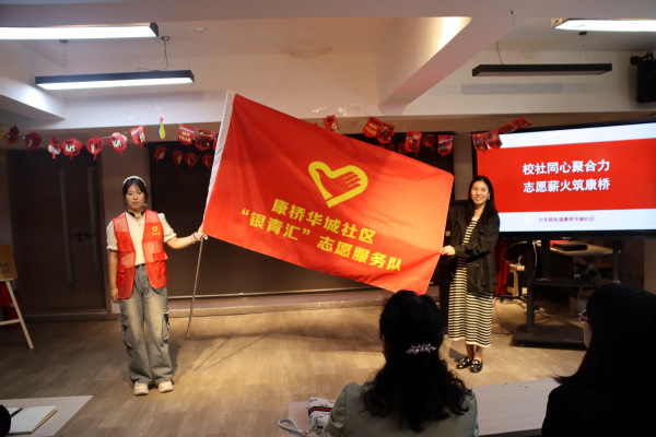 仪式上,与会领导共同为我校青年志愿服务实践基地揭牌。为更好地向社区老年人提供志愿服务,社区与学校共同成立“银青汇”志愿服务队,白玉芳书记现场为“银青汇”志愿服务队授旗。志愿服务实践基地揭牌和“银青汇”志愿服务队授旗,标志着学校与社区的合作迈上了新台阶。